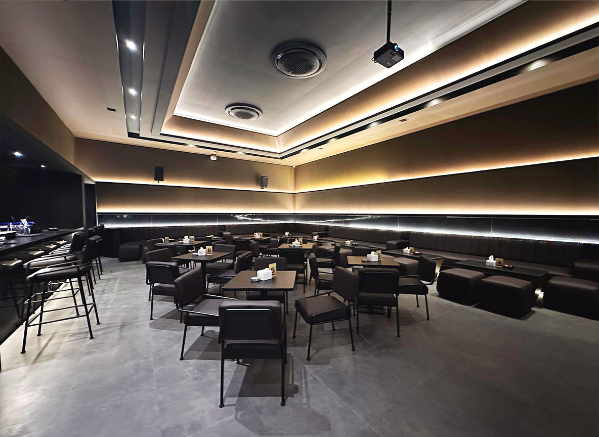 • Social & Private Zoning: The layout is strategically planned so that the guest flow in the lounge remains undisturbed by activities in the private karaoke rooms. Connecting corridors are designed with dark tones and floor lighting accents to evoke an exclusive and mysterious feel.