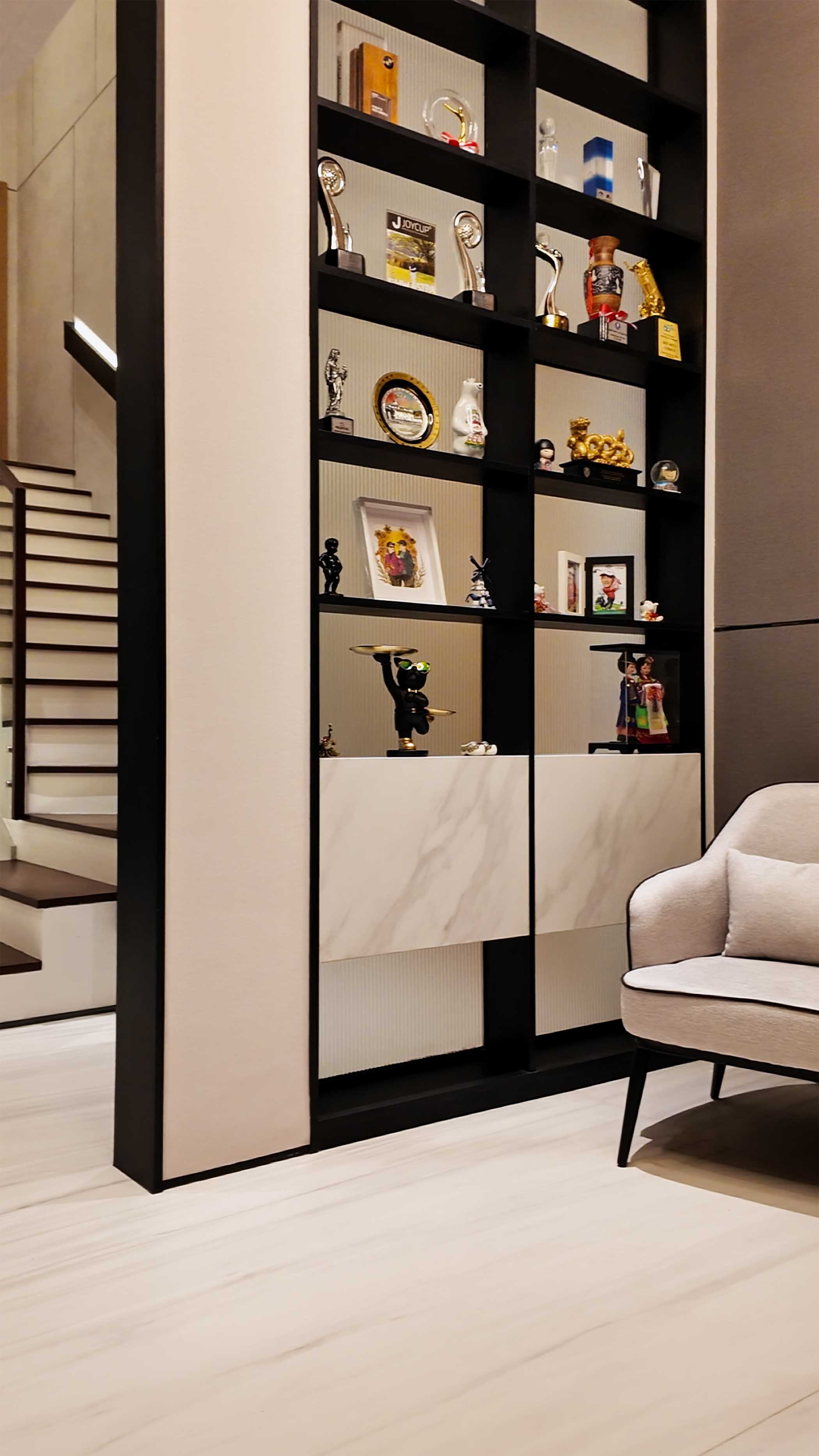 • Efficient Space Integration: Utilizing the under-stair area for hidden storage and using open shelving as room dividers that do not block the view ensures the space remains airy and uncluttered.