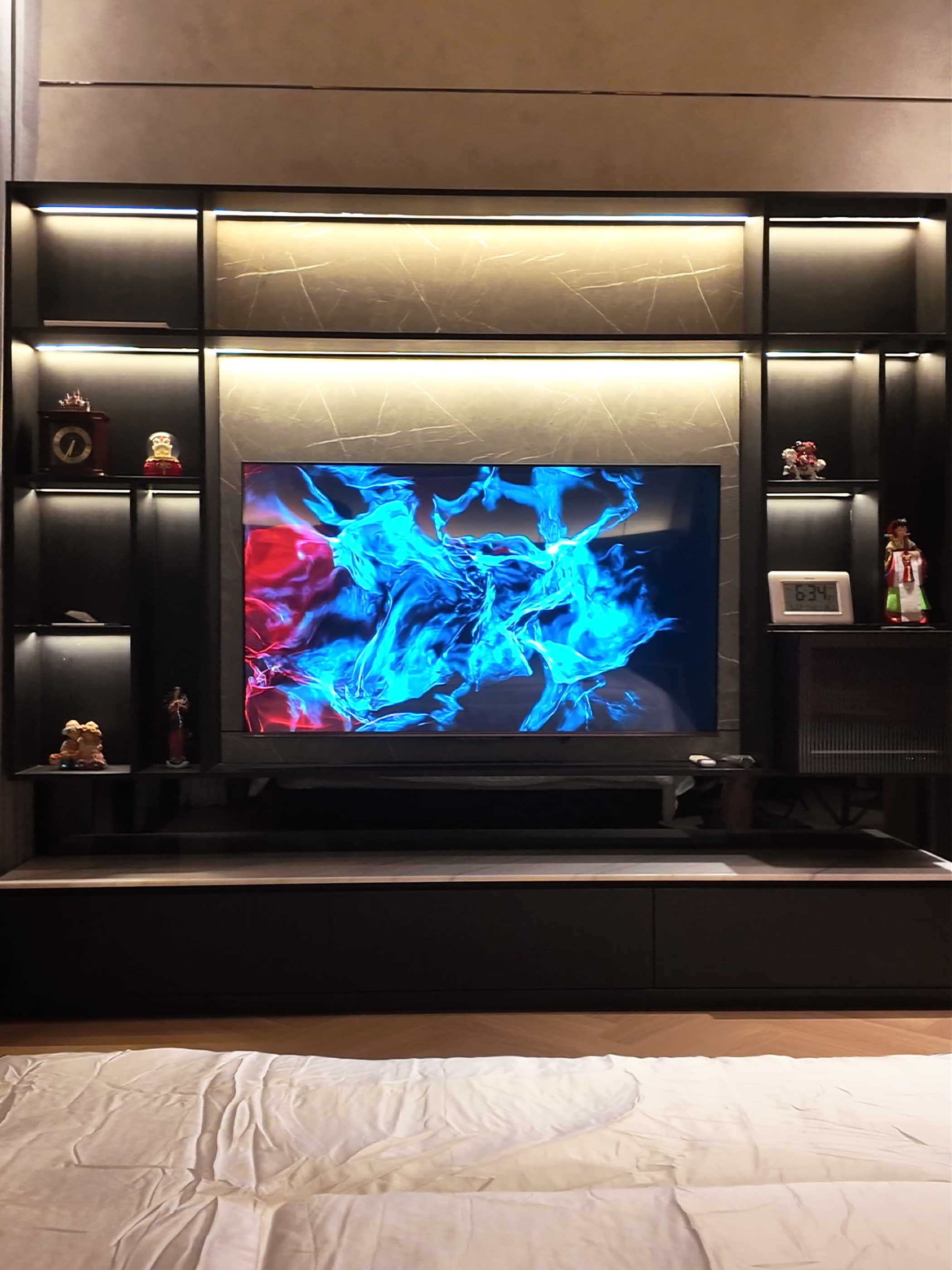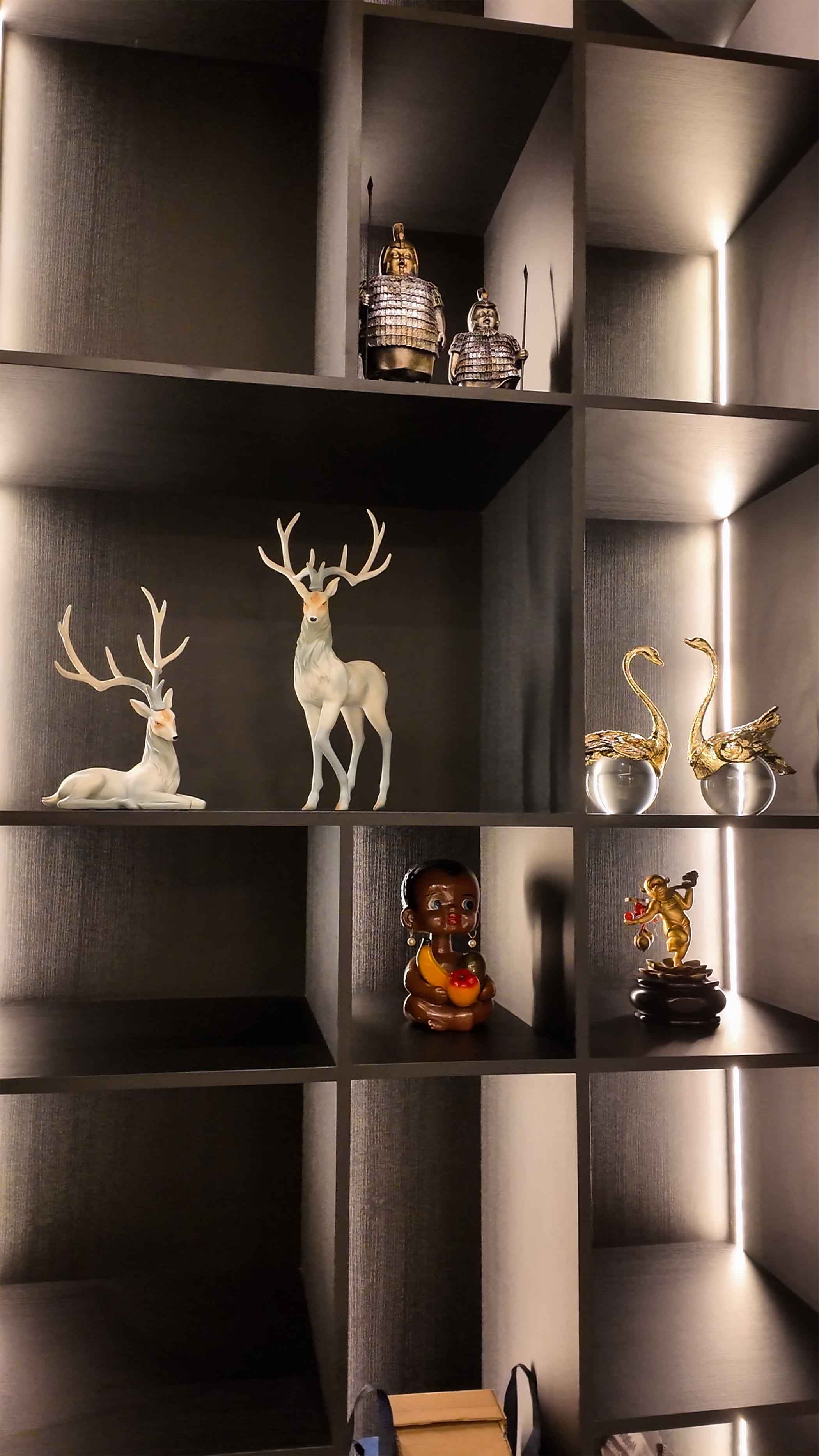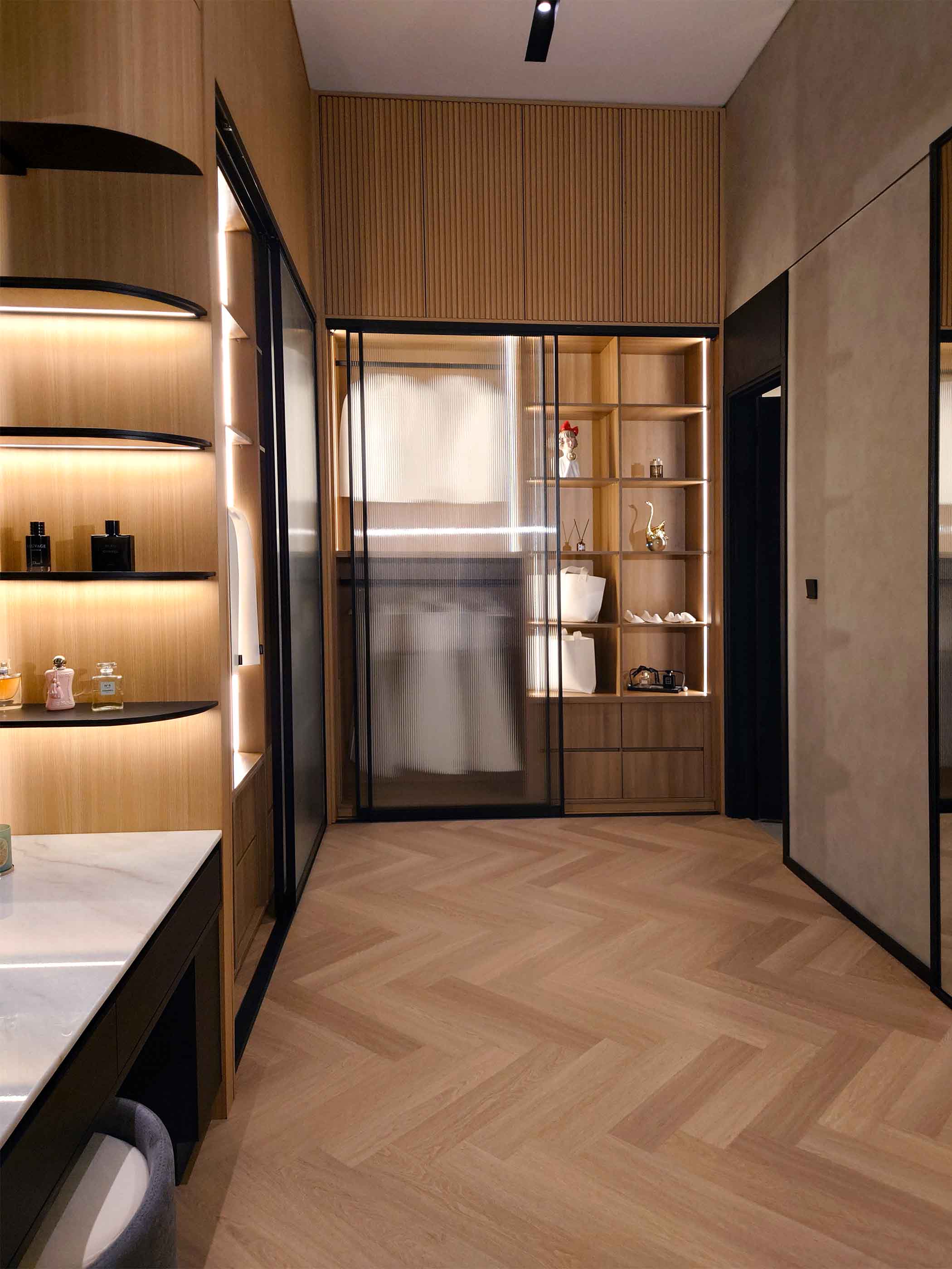 • Architecture of Light: Beyond natural light from large windows, the design heavily relies on lighting layers. Ceiling cove lighting, hidden LED strips in the shelving, and an iconic gold spiral chandelier act as "room jewelry" while defining the mood.