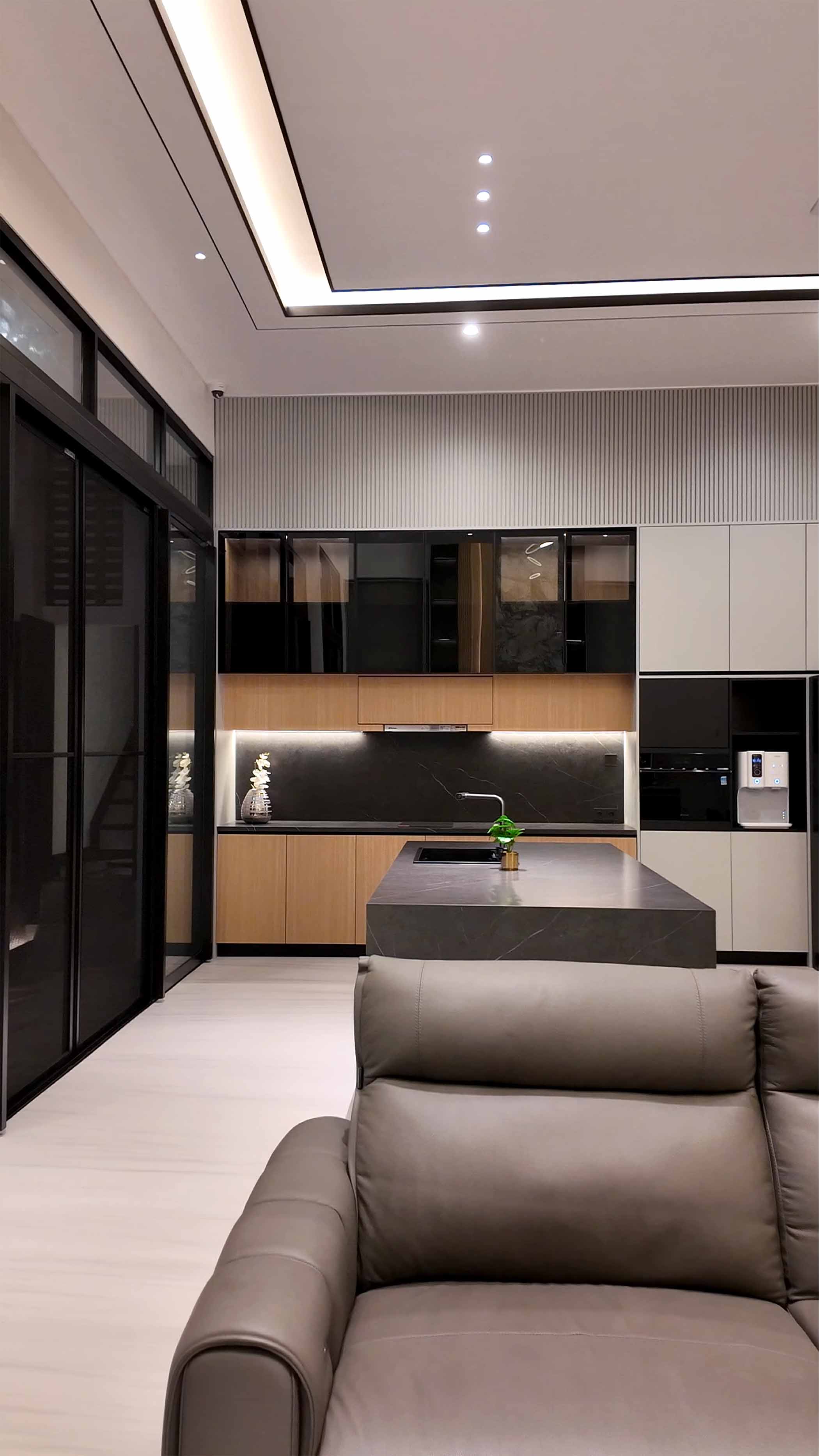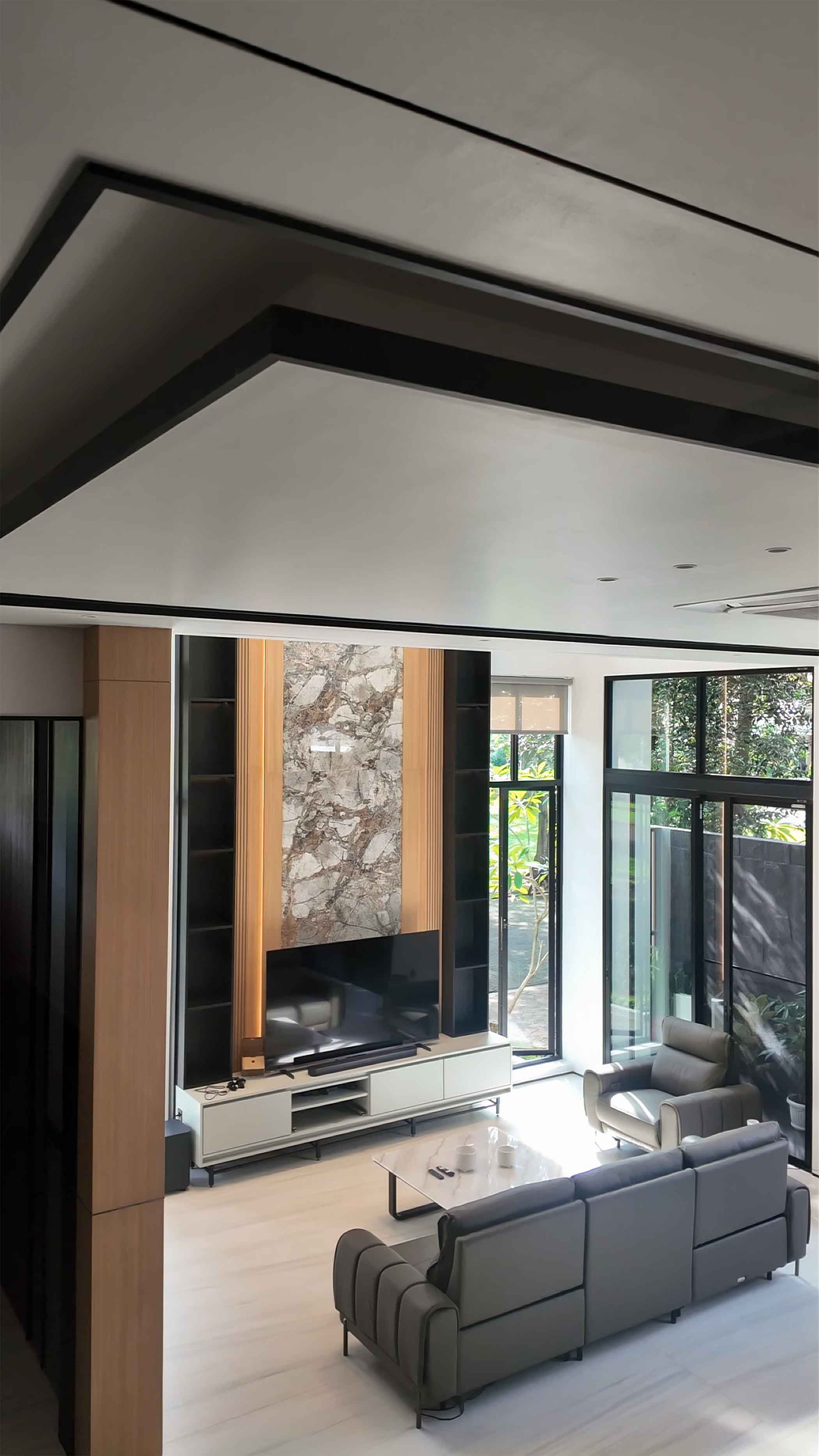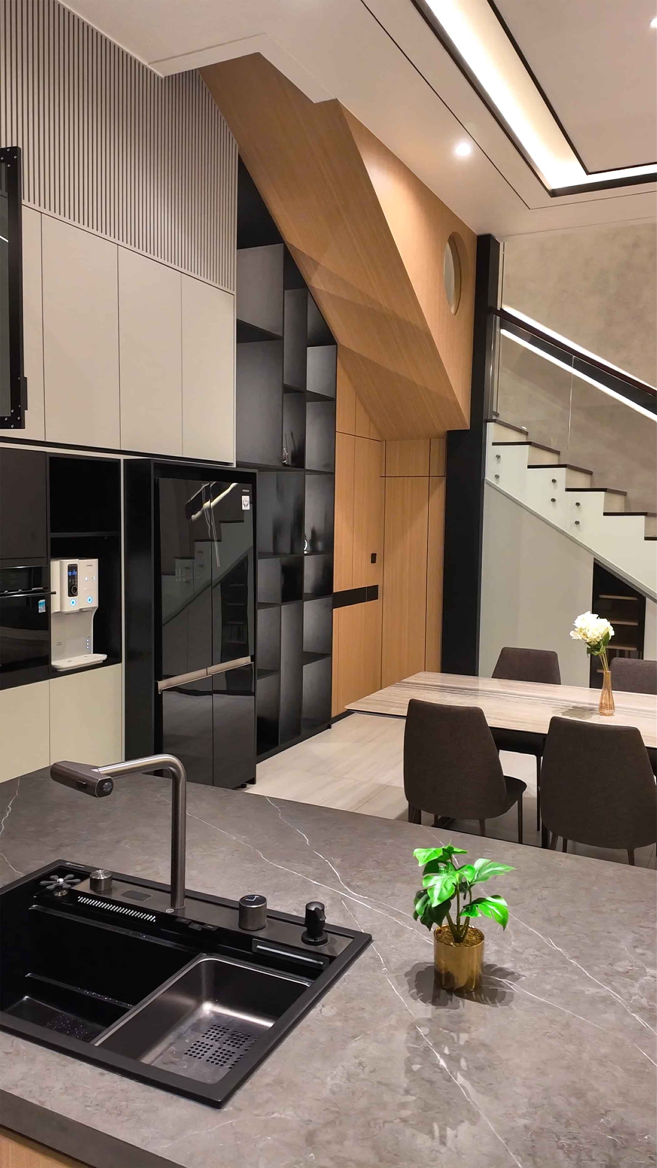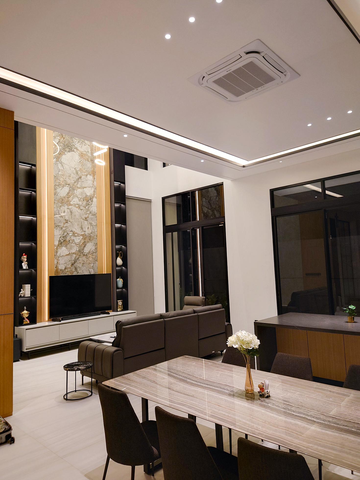 The interior of this home embodies a Luxury Modern Contemporary style, maximizing the sense of space through an open-plan concept and double-volume ceilings. The living area serves as the focal point with a magnificent TV feature wall, utilizing a marble slab with dramatic veining flanked by wooden slats and warm backlit illumination. The use of premium materials—such as natural stone, wood, glass, and black metal accents—creates an atmosphere that is both elegant and inviting. The kitchen and dining areas flow seamlessly without partitions, providing a dynamic spatial experience for the residents.