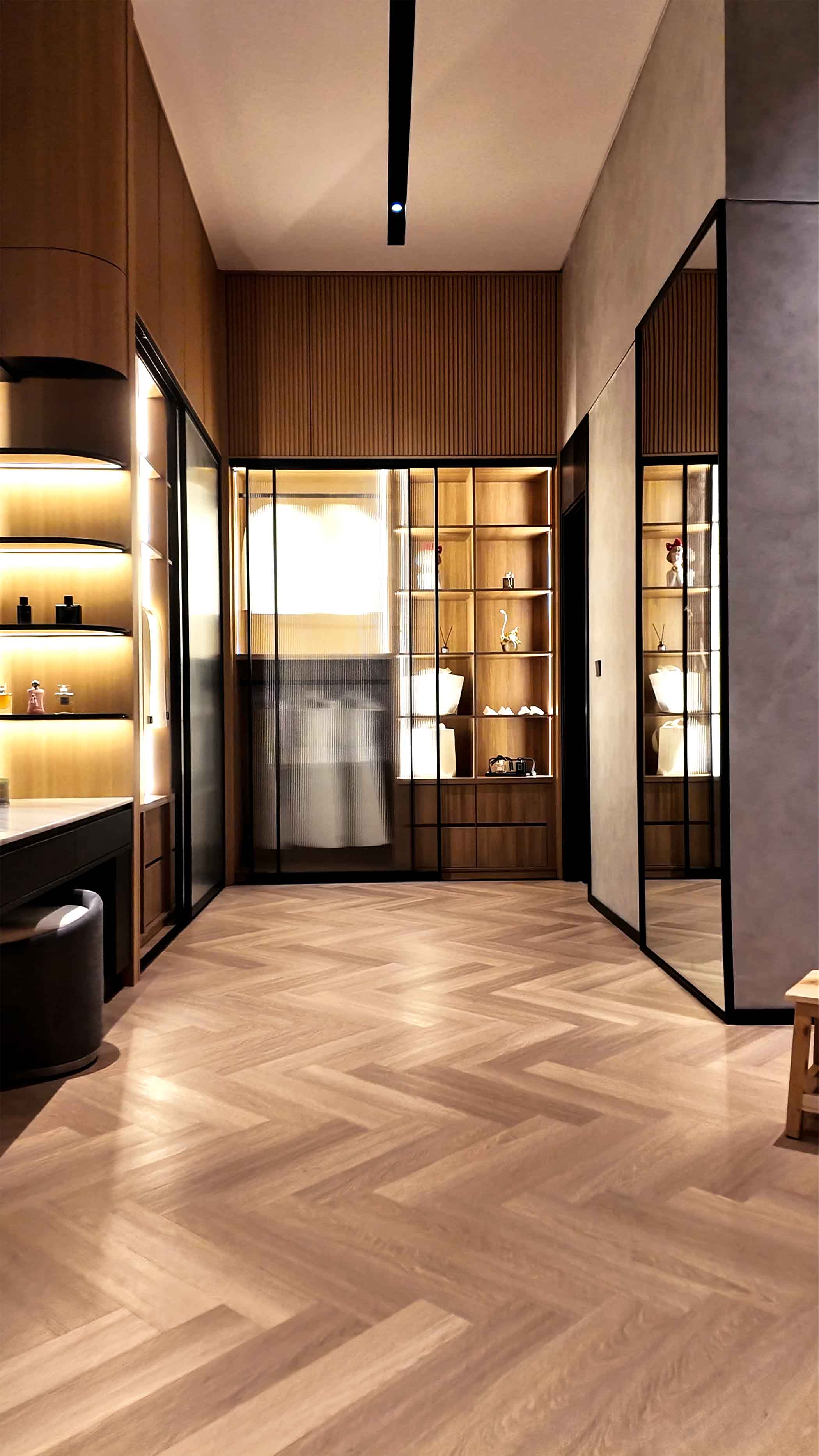 This concept focuses on the harmonious blend of diverse material textures and sophisticated lighting play to create subtle luxury.