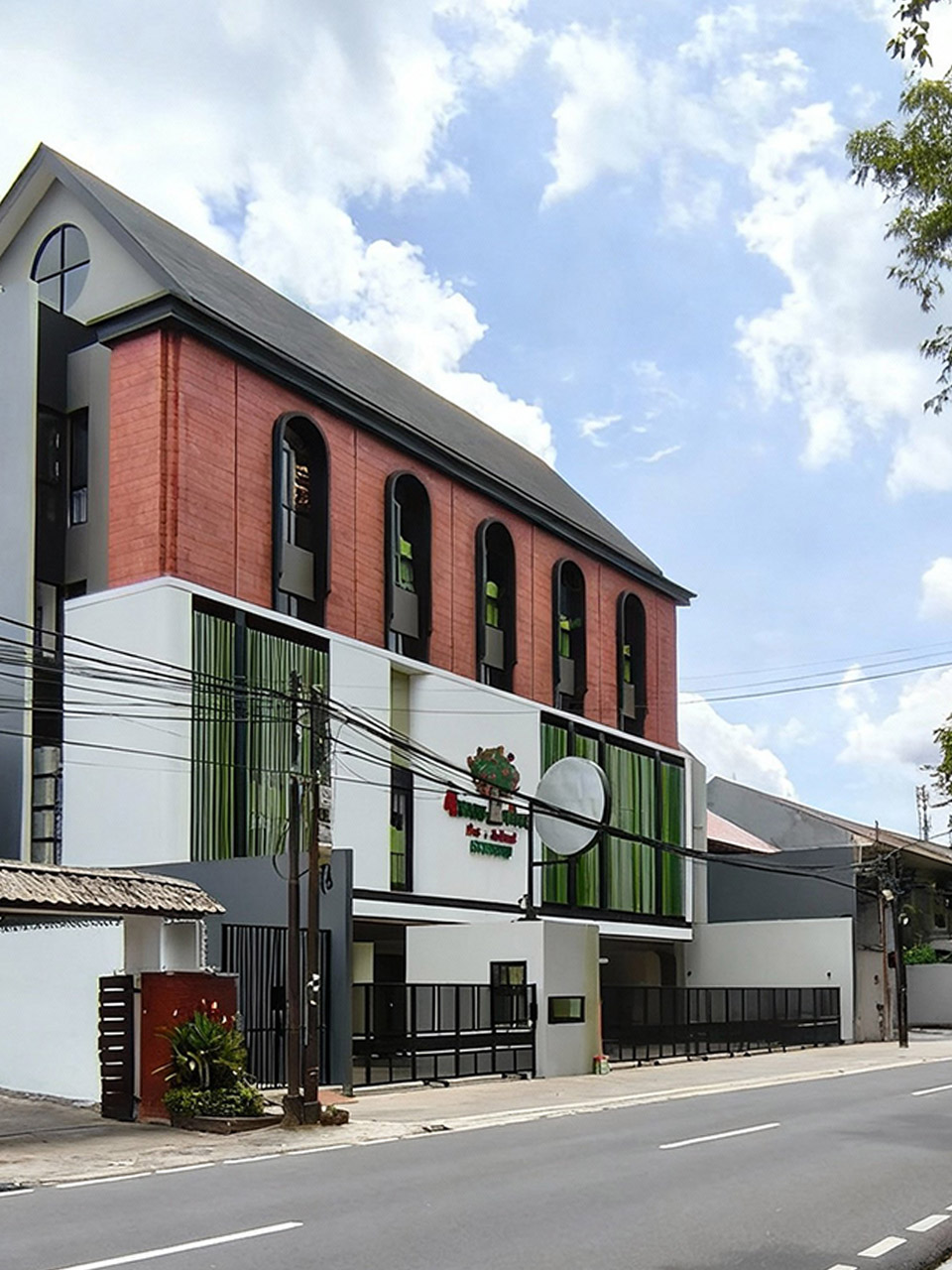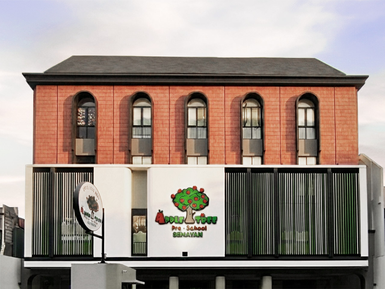 The Apple Tree Pre-School Senayan building features a unique facade with two distinct yet harmonious visual zones. The upper section is dominated by terracotta-colored panels with five symmetrical arched windows, evoking a sense of classic and established architecture reminiscent of iconic traditional educational institutions. In contrast, the lower level presents a striking modern look with clean white walls and vertical louvers, providing dynamic texture while ensuring privacy for the learning areas within.