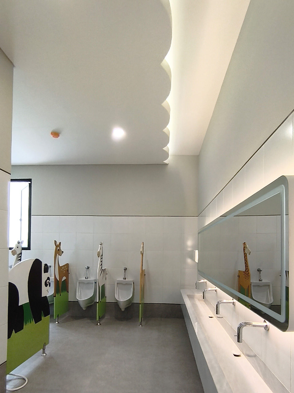 ⦁ The Vertical Rhythm: The use of vertical louvers on the ground floor creates a consistent visual rhythm, serving as an aesthetic element and a natural light filter to keep the classrooms cool and comfortable.
