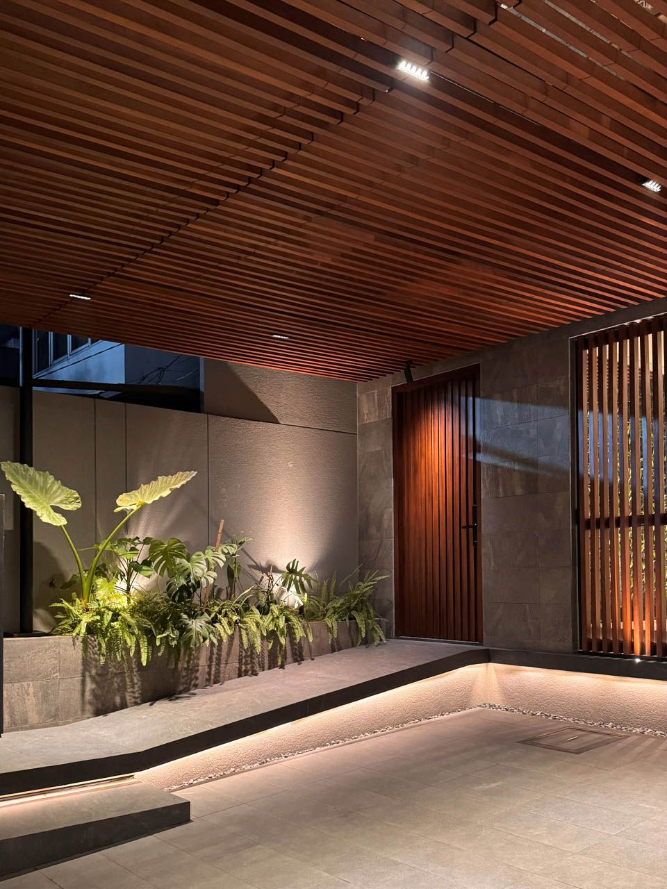 AS House is a modern residence that explores the richness of local materials through a contemporary lens. The most striking feature is the second floor, enveloped in a secondary skin made of woven rattan panels in warm brown tones, arranged within vertical frames. The structure is flanked by two towering exposed concrete walls, providing a solid and monolithic impression. At the top, a dark gable roof shelters a lush open balcony featuring a shade tree, while the ground level is equipped with a minimalist black gate and a carport roof with wooden slat detailing.