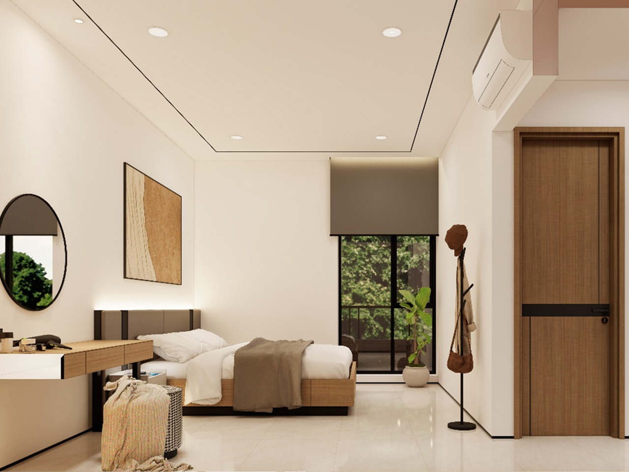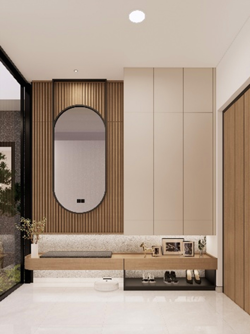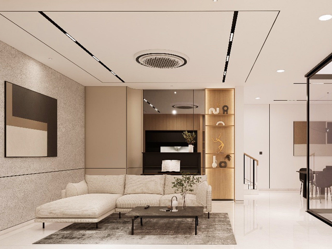 • Artistic Lighting: The design uses indirect lighting and track lights to highlight wall textures and create an elegant, professional ambiance.