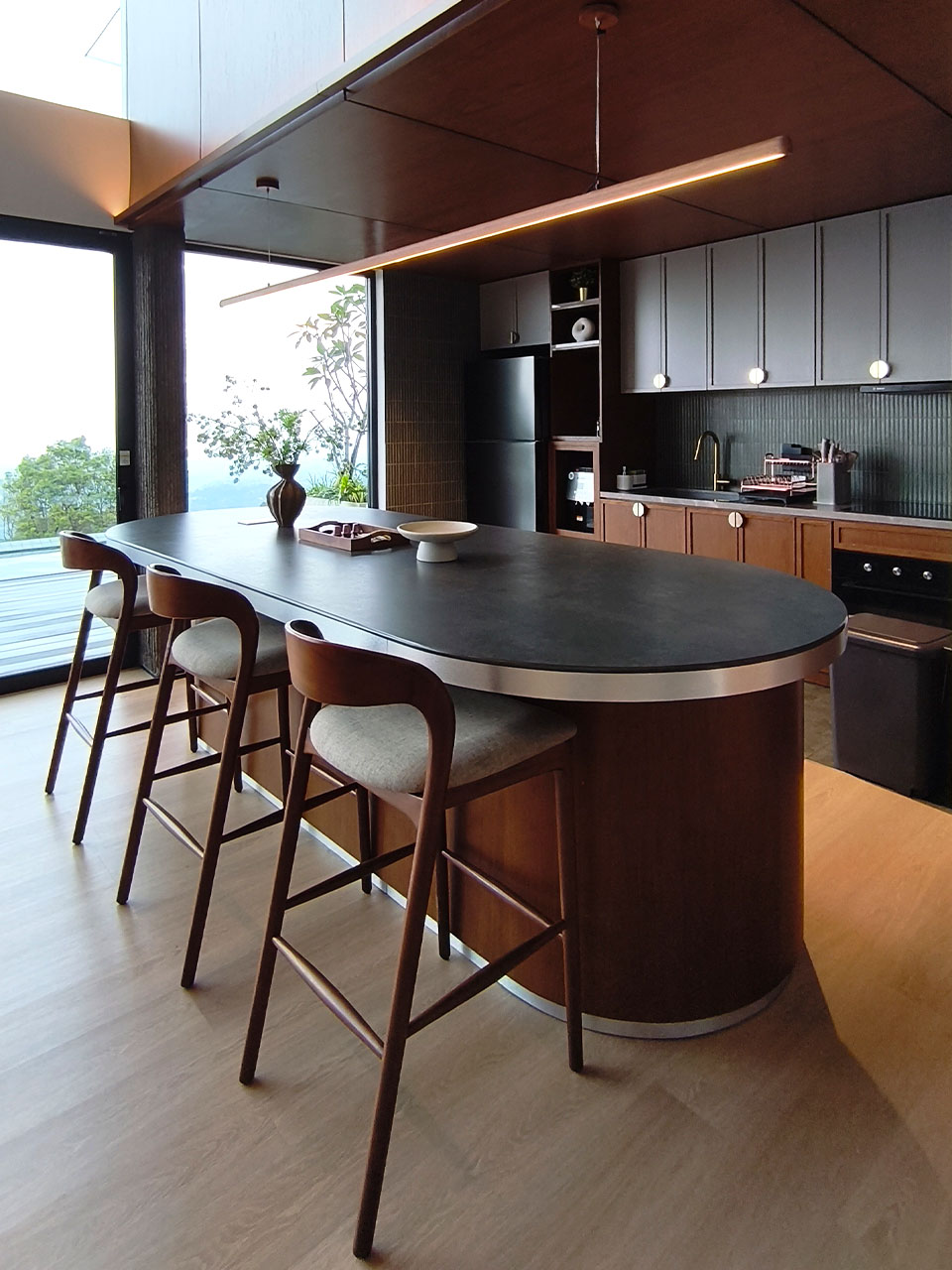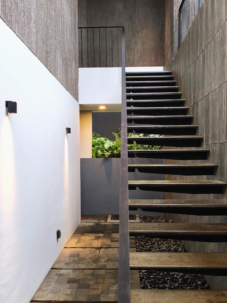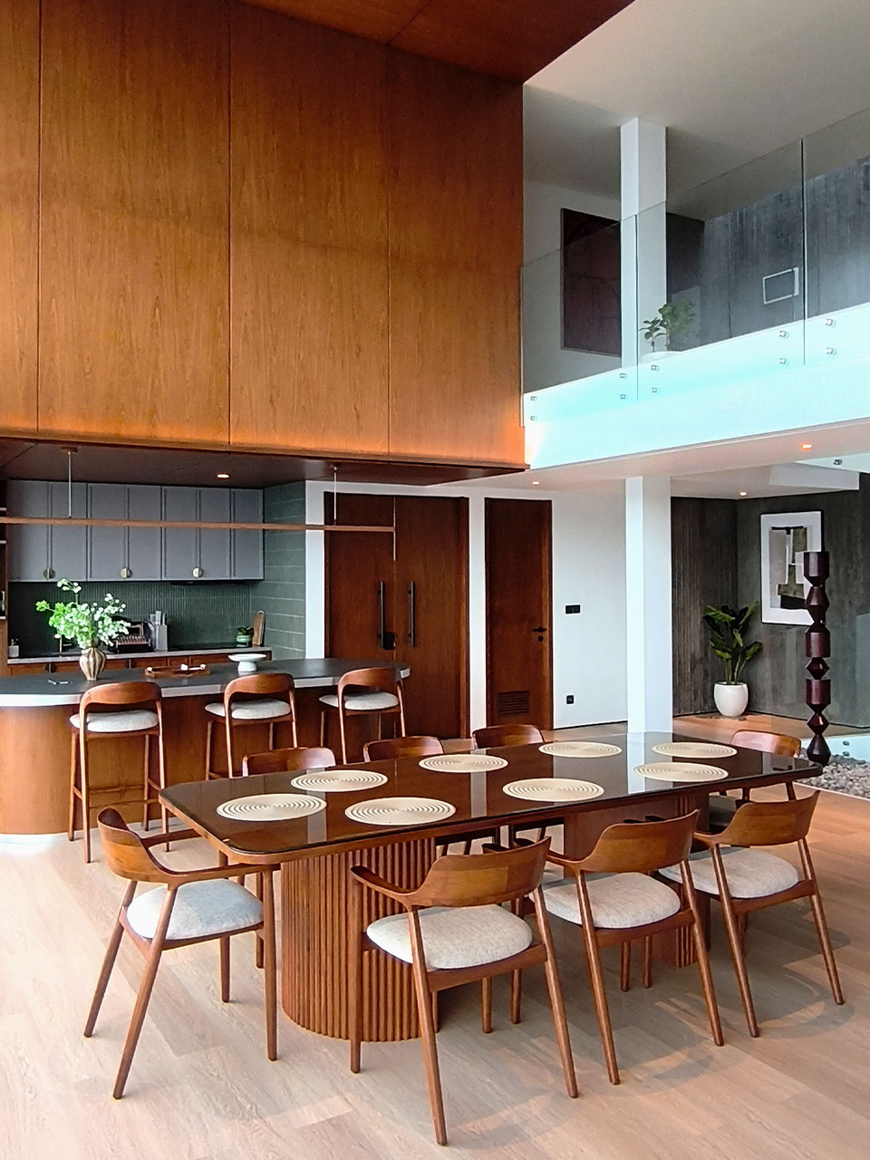 ⦁ Natural & Industrial Materiality: The combination of raw concrete, warm timber, and black metal frames creates a balance between a modern industrial feel and the warmth of a tropical home.