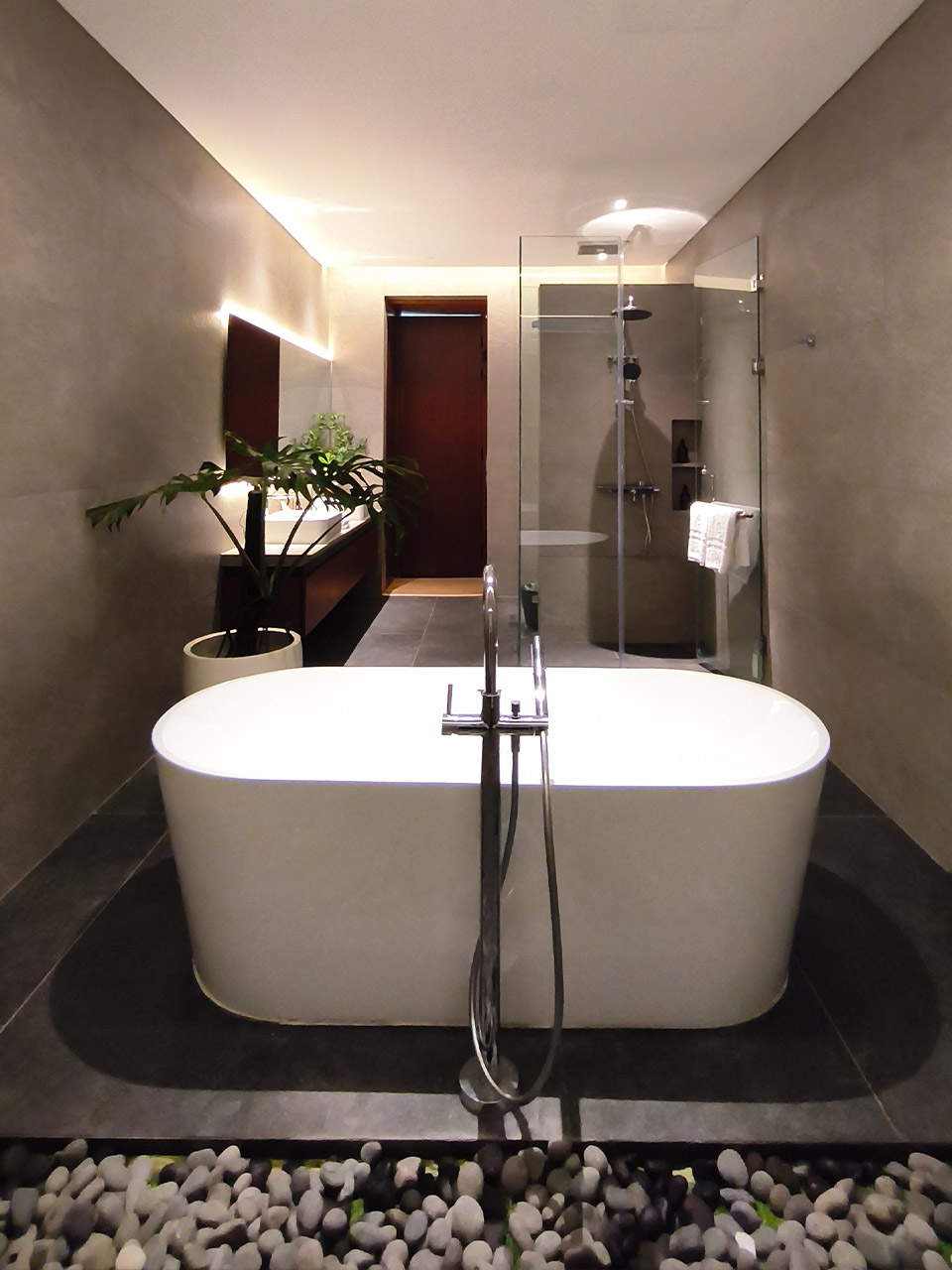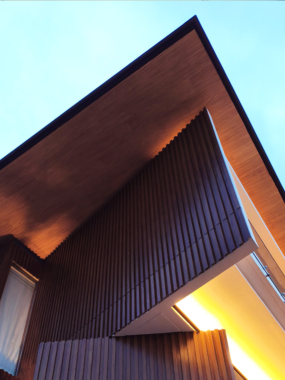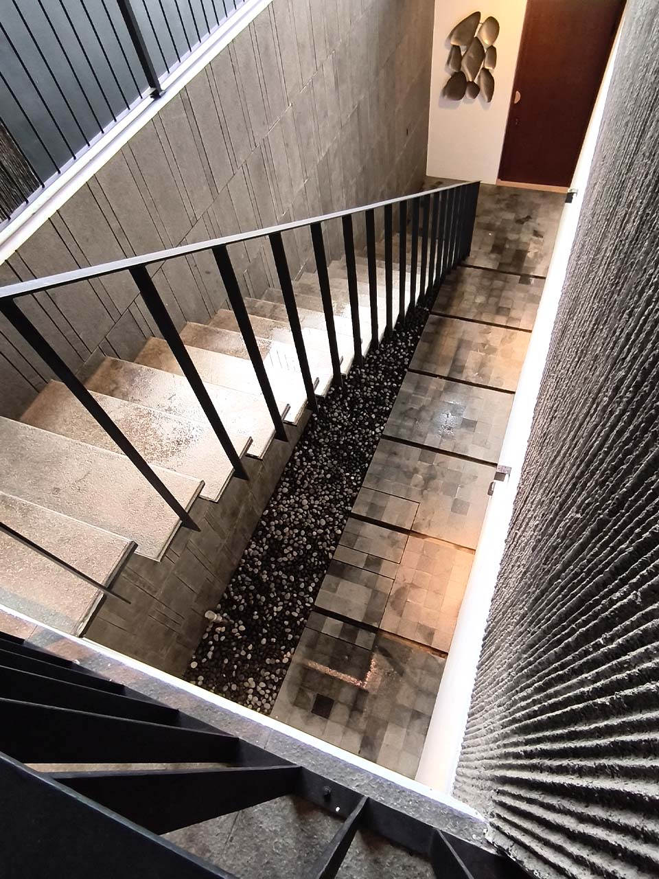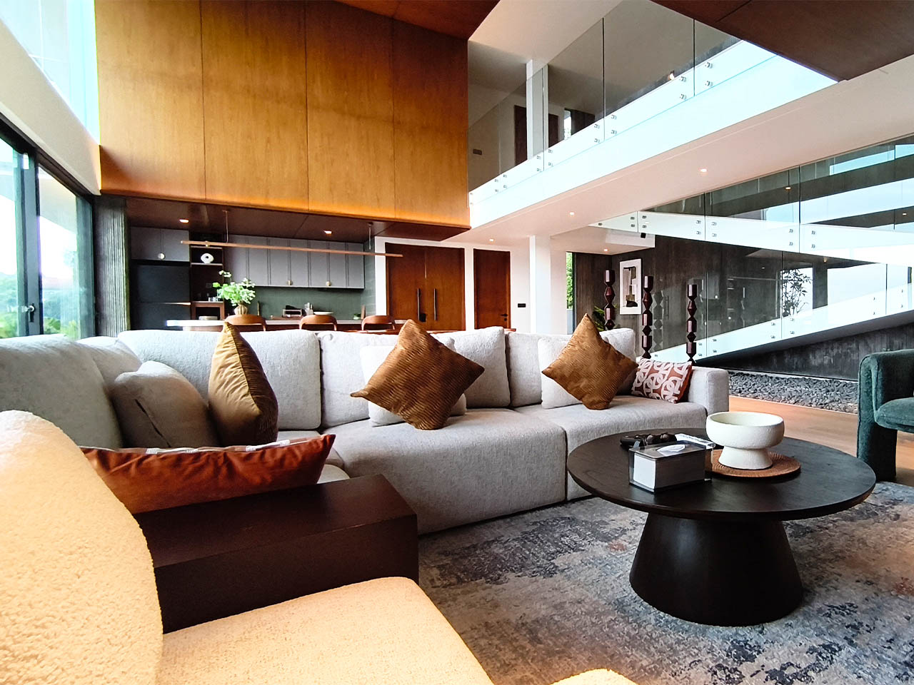 ⦁ Natural & Industrial Materiality: The combination of raw concrete, warm timber, and black metal frames creates a balance between a modern industrial feel and the warmth of a tropical home.