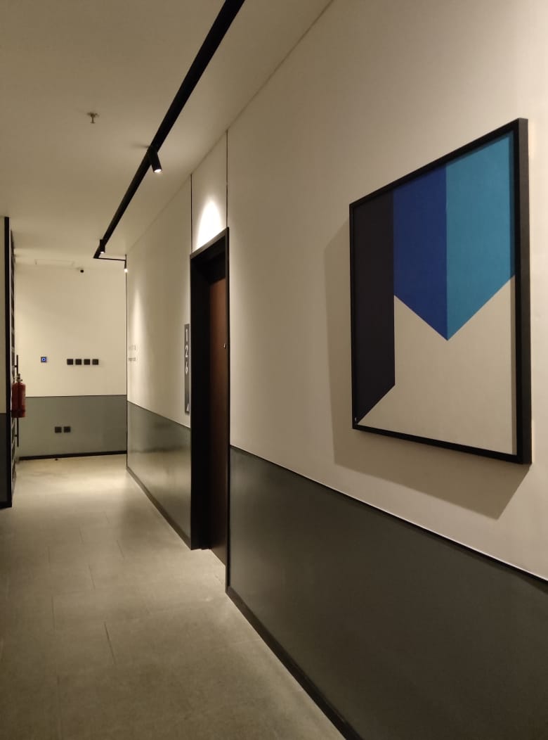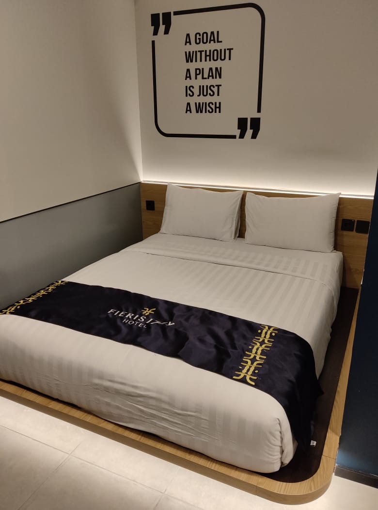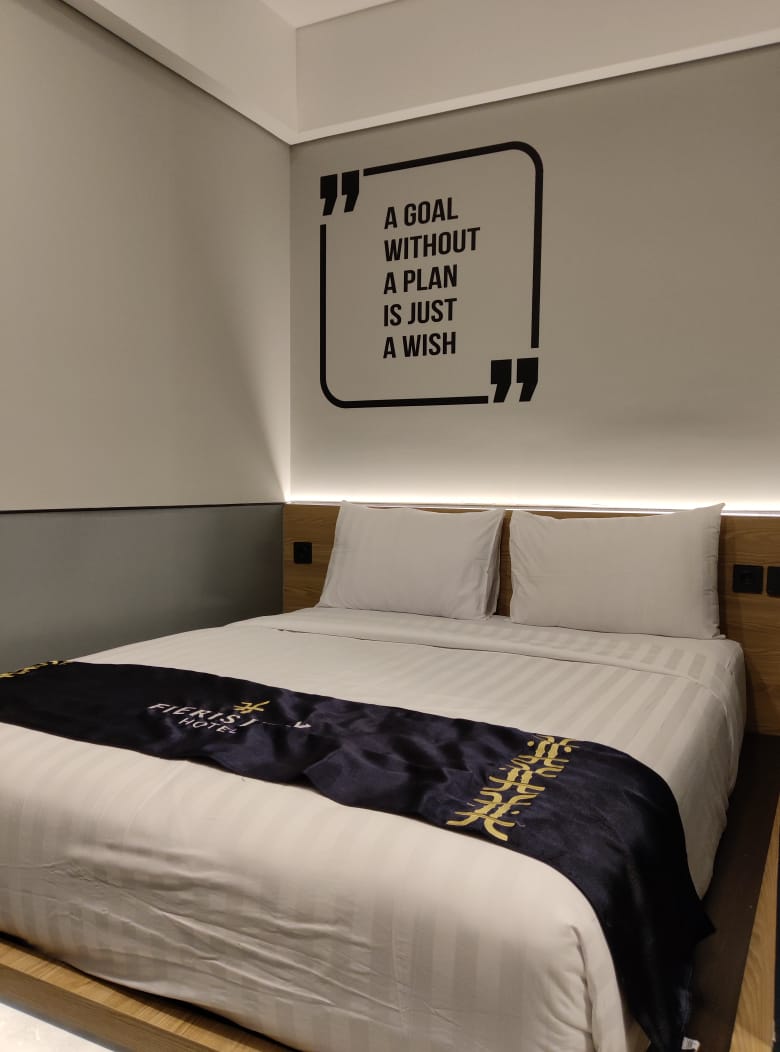 The interior of Fieris Hotel showcases a Luxury Minimalist Modern style, blending urban hotel functionality with high-end residential comfort. The main public area features a grand double-volume ceiling anchored by an artistic spiral LED chandelier as the centerpiece. Guest rooms are designed with a minimalist yet warm approach, utilizing wooden headboard panels and soothing indirect lighting. The hallways are clean and professional, enhanced by abstract art and clear navigational signage.
