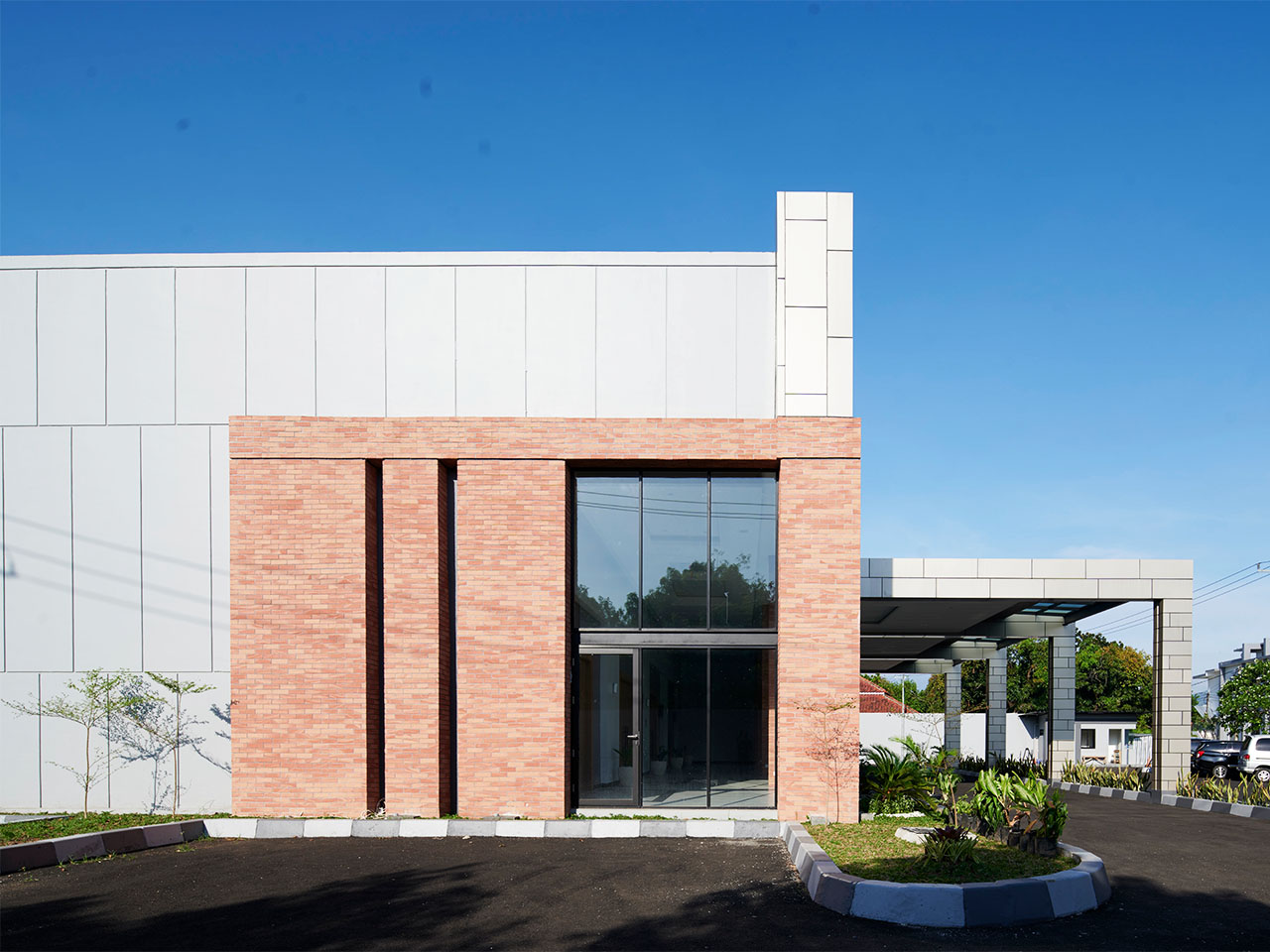 ⦁ Material Integrity: The facade utilizes a sophisticated palette of red brick and grey metallic panels. The brickwork provides texture and a sense of history, while the large-scale panels on the upper floor add a clean, professional finish.