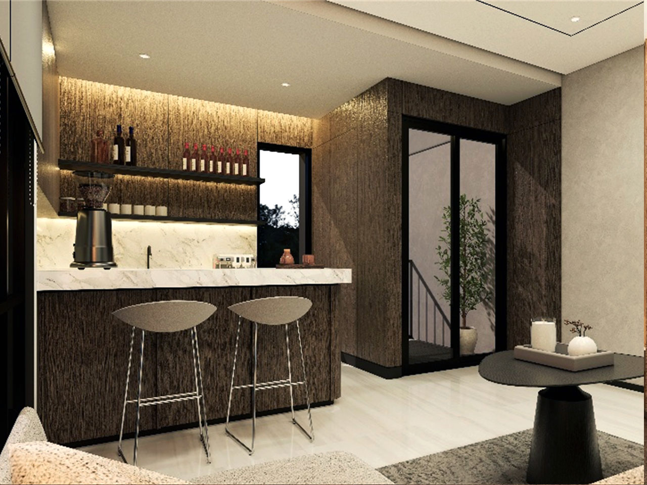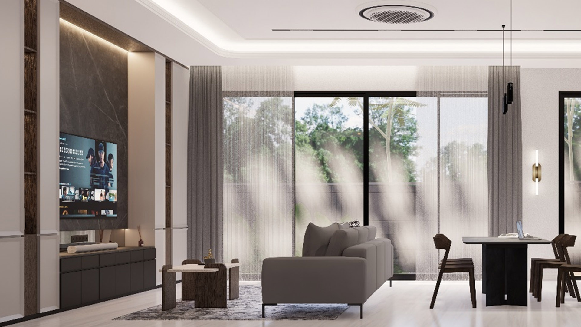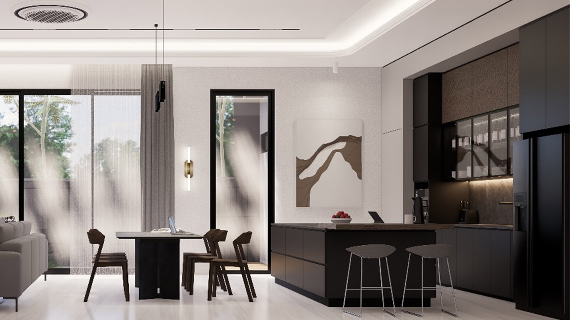 • Collaborative Workspace: Features an open-plan layout with communal desks and biophilic integration (indoor plants) to improve air quality and employee productivity.