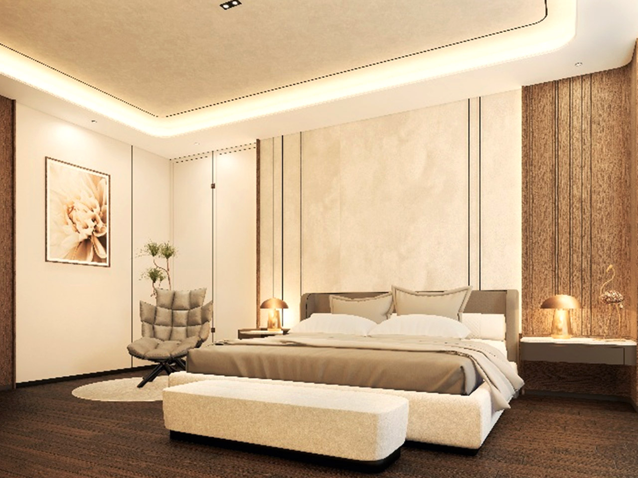 • Reception & Public Areas: Utilizes a blend of vertical wood slats, bold-veined marble, and indirect lighting to deliver a grand and trustworthy first impression.