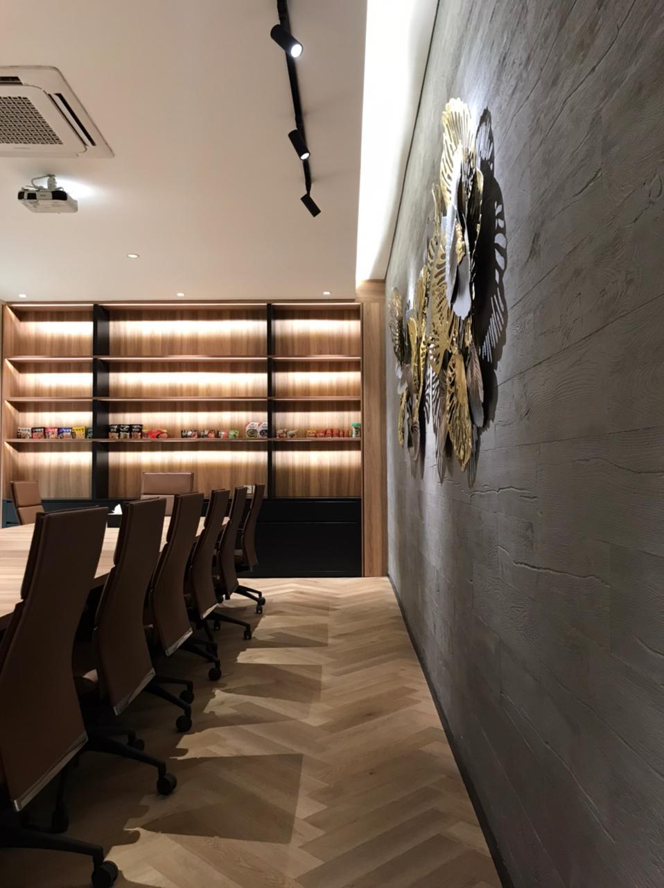 • Breakout Area & Pantry: Designed like a modern café, this area features comfortable leather sofas, a coffee bar with wooden accents, and a "green wall" of hanging plants to provide a refreshing atmosphere for rest.