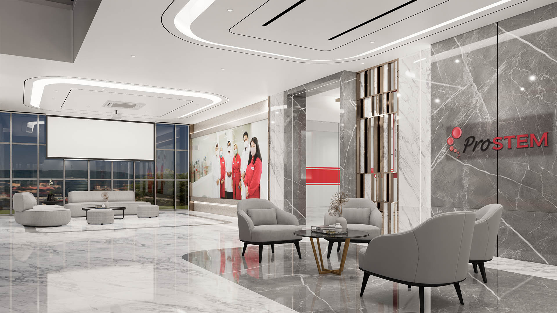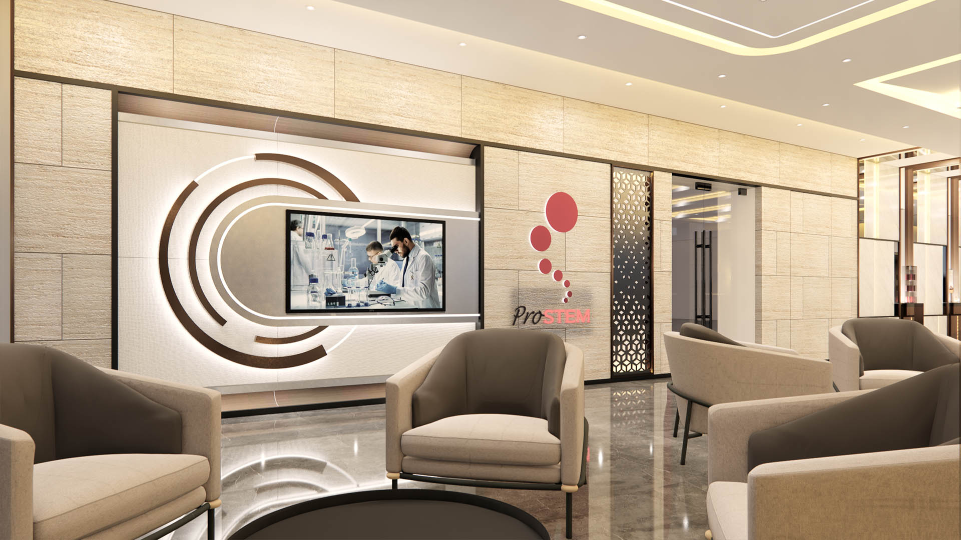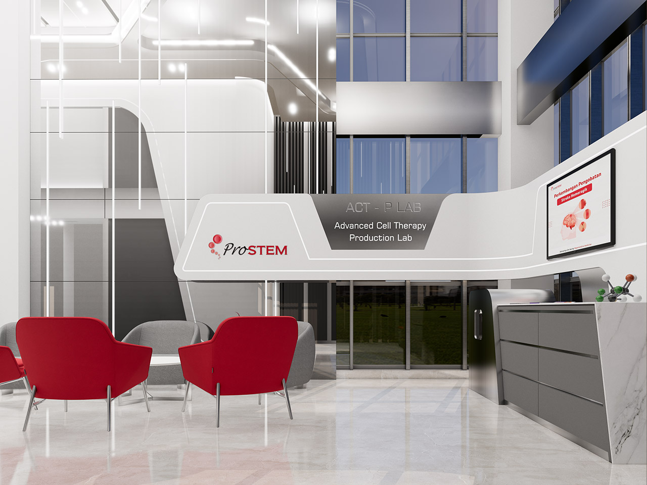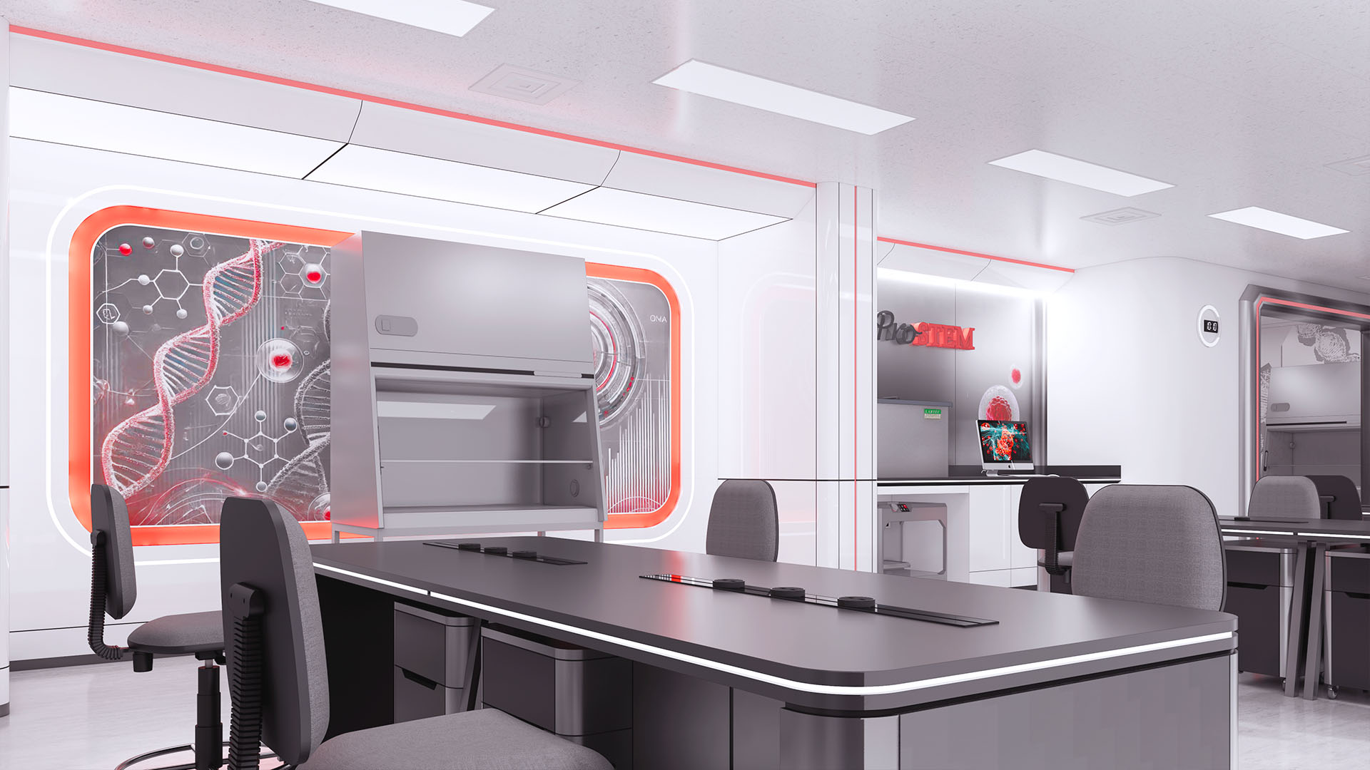 • Futuristic Laboratory (ProSTEM): The lab areas utilize a clean white palette with futuristic linear LED lighting to convey a sterile, high-tech, and professional impression.