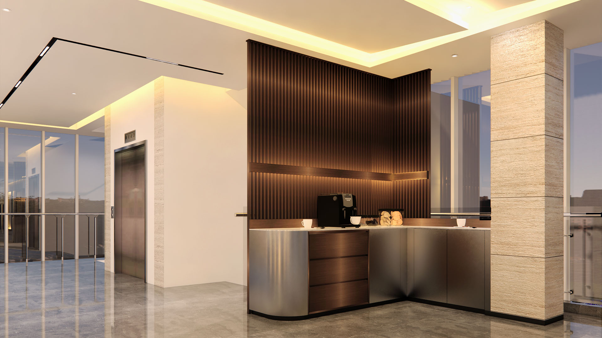 This concept merges modern office efficiency with a warm industrial aesthetic. The goal is to create a transparent, collaborative environment with a strong corporate identity that remains comfortable for both employees and guests.