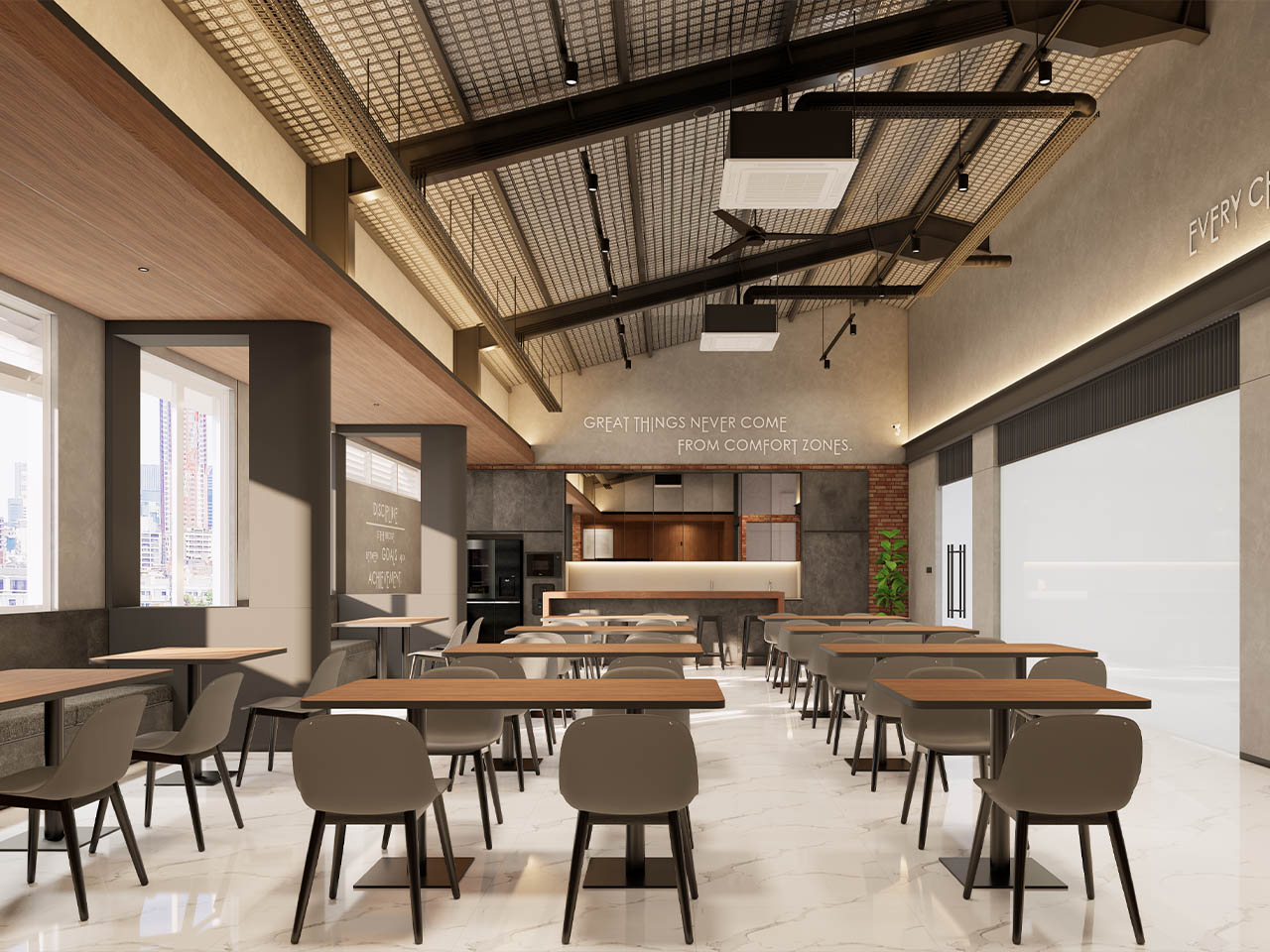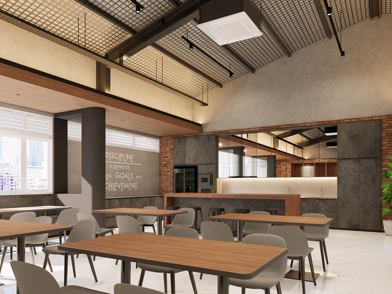 • Industrial Touches (Pantry/Canteen Area): Features exposed brick walls, high steel frame ceilings, and industrial pendant lighting to create a relaxed yet productive atmosphere in the breakout zones.