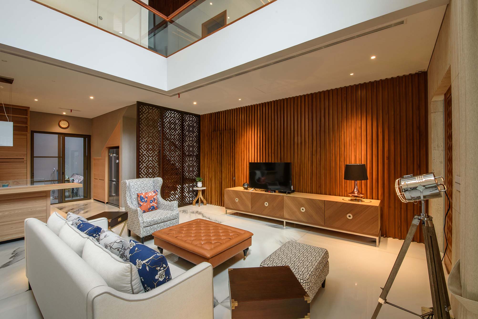 The interior of this home embodies a Modern Tropical Contemporary style, emphasizing open spaces and rich textures. The main living area features a grand double volume ceiling that enhances the sense of scale and ensures maximum air circulation. The room's focal point is a dramatic book-matched marble TV feature wall, flanked by vertical wooden slats. The use of woven rattan in furniture and partitions acts as a recurring accent that seamlessly bridges the exterior concept into the interior, creating a fluid transition between outside and in.