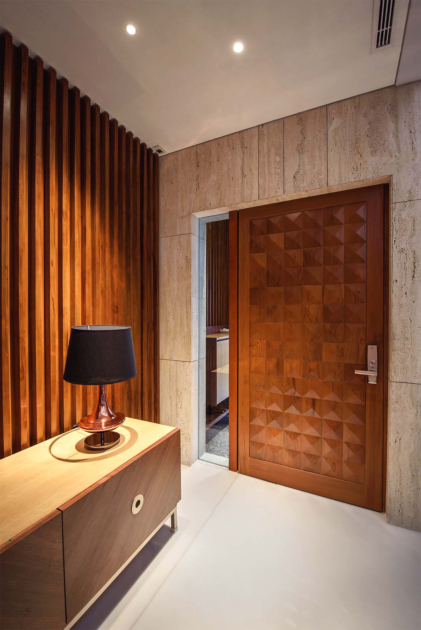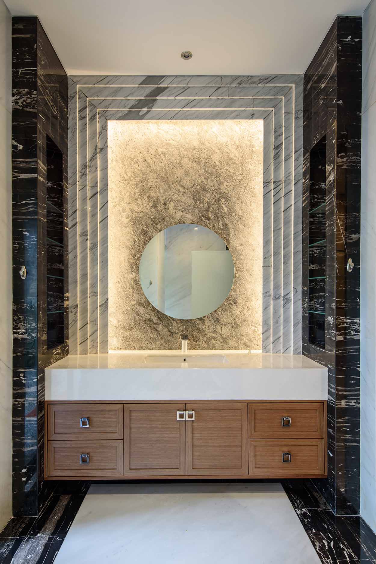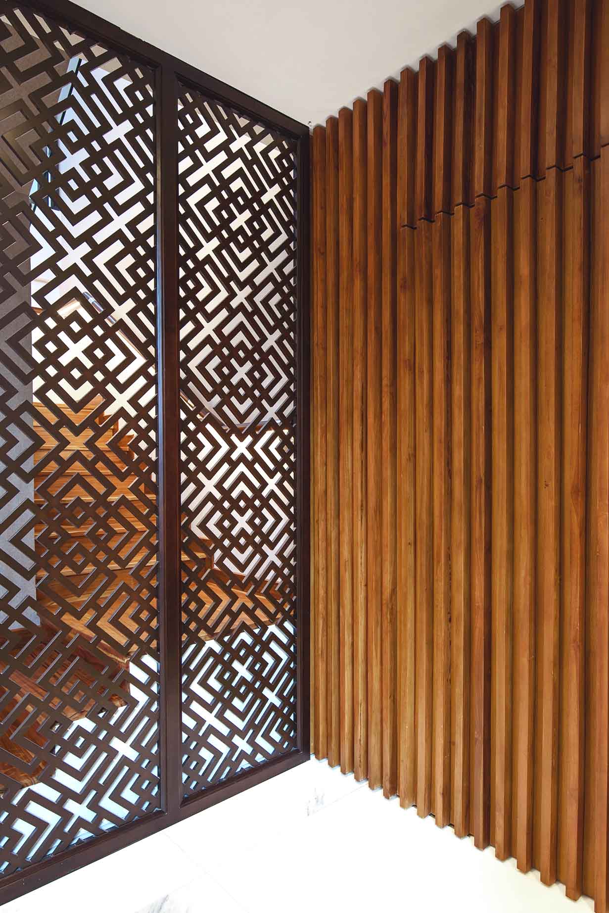 Material Balance: The fusion of elegant marble, bold black steel, and warm wood creates harmony between modern luxury and tropical comfort.