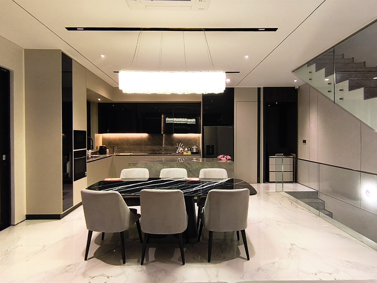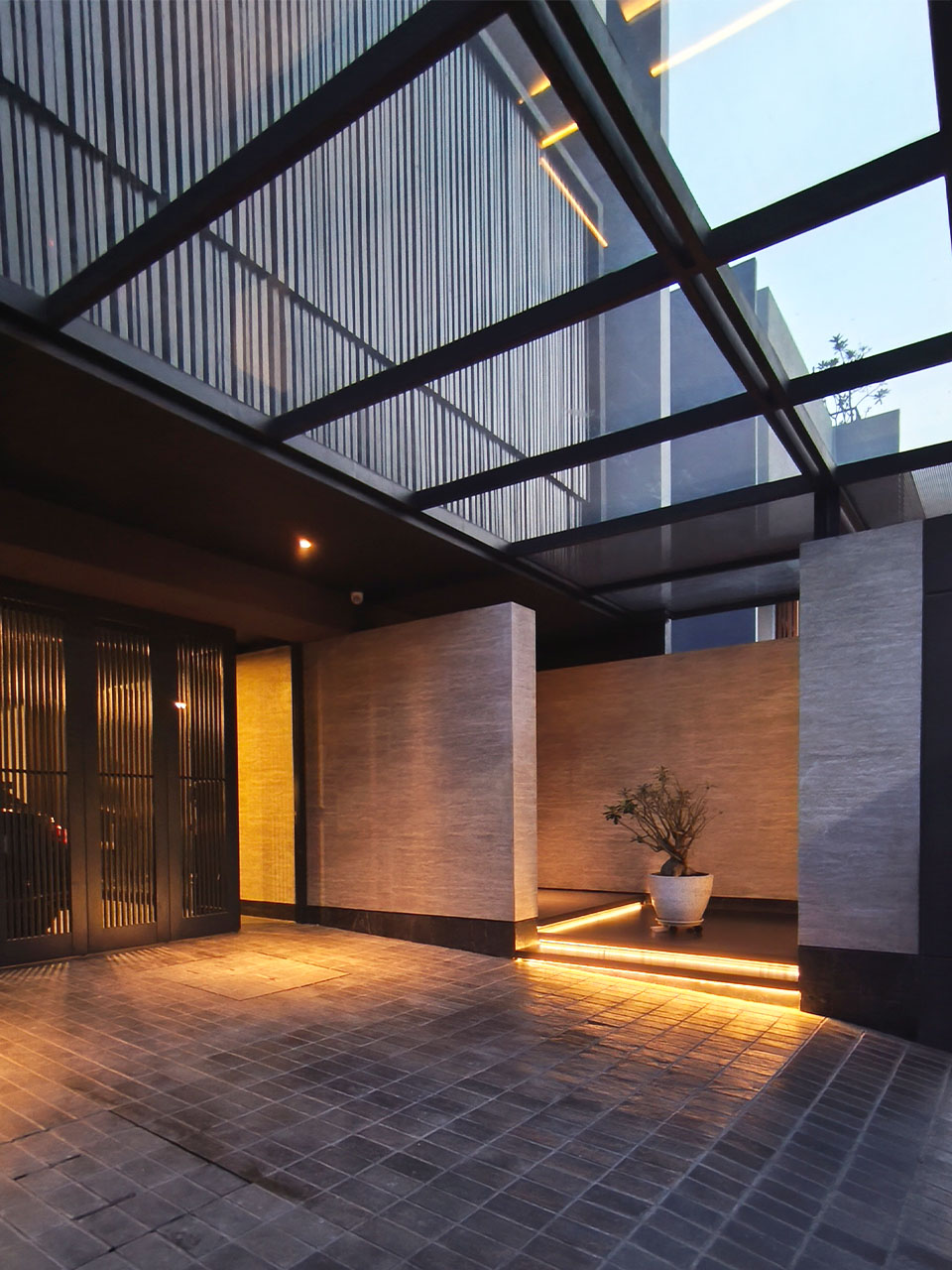 ST House is a three-story residence featuring a robust Modern Minimalist architectural approach. The building efficiently utilizes vertical space through a series of dynamically stacked box-shaped volumes. The facade is dominated by a blend of smooth grey concrete textures, dark wall panels, and vertical wooden louvers serving as a secondary skin. The strategic placement of warm white LED lights within the building's crevices creates a "line of light" effect that accentuates its geometric form during twilight.